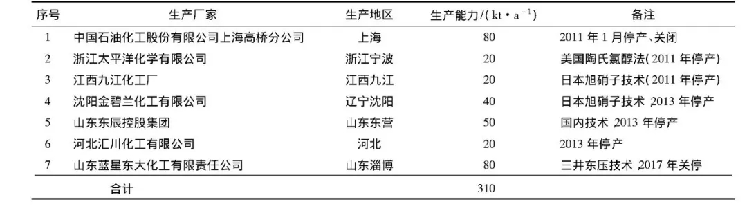 2《 我國(guó)環(huán)氧丙烷生產(chǎn)企業(yè)基本狀況》:截至2019年3月,我國(guó)共有環(huán)氧丙烷生產(chǎn)企業(yè)23家,其總生產(chǎn)能力為3 347 kt/a,其中氯醇法產(chǎn)能為1 812 kt/a,占總產(chǎn)能的54.14%;共氧化法的產(chǎn)能為1 015 kt/a,占總產(chǎn)能的30.33%;HPPO法的產(chǎn)能為400 kt/a,占總產(chǎn)能的11.95%;異丙苯CHPPO法的產(chǎn)能為120 kt/a,占總產(chǎn)能的3.59%。環(huán)氧丙烷生產(chǎn)企業(yè)的基本情況如表2所示。